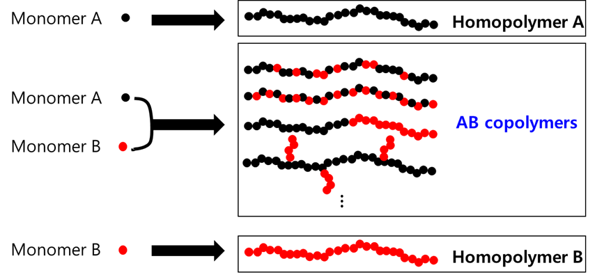 2 종 이상의 단량체(monomer)를 한 중합체안에 화학적으로 같이 연결해 놓는다고 보면 되겠다. 블렌드관련 포스팅에서 왜 자꾸 섞는가에 대한 답변으로 "좋은 특성을 한 재료에 더 많이 구현시키기 위해서" 라고 했는데, 이 녀석도 비슷하다. 결국은 더 좋은 고분자를 만들기 위함이다.